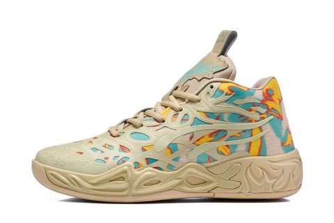 Баскетбольные кроссовки ЛаМело Болла - PUMA MB.04. Новая модель имеет более сложную конструкцию и выполнена в средней высоте, для лучшей фиксации голеностопна. Продолжая тенденцию прошлых пар этой линейки, Puma MB.04 выделяется прочной основой из ТПУ, а за амортизацию отвечает пена Nitro Foam, она гарантирует комфорт и сцепление для исключительной производительности в игре. Изюминка модели, яркий и динамичный дизайн. Хаотичные линий и надпись «Loverare Of One» отлично вписались в общую тенденцию стиля. На язычке изображён личный брендинг LaMelo - Феникс, а на пятке инициалы баскетболиста «LB». Баскетбольные кроссовки PUMA MB.04 отлично подойдут для любой позиции, они удовлетворяют потребностям баскетболиста в дизайне и производительности. Купить PUMA MB.04 кроссовки баскетбольные недорого, вы можете в онлайн магазине Basketroom.ru